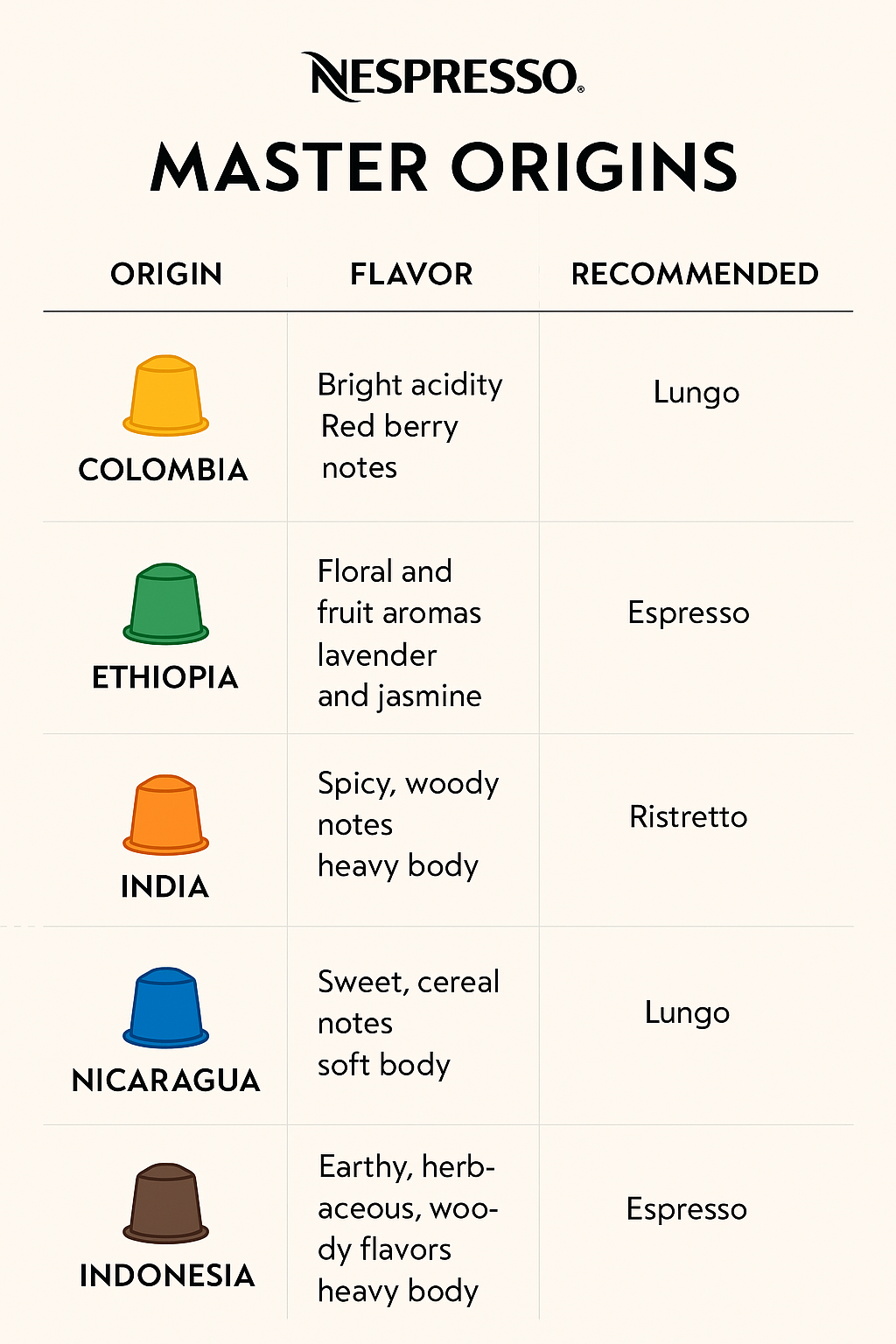 Master Origins는 커피가 태어난 원산지에서 영감을 받아 고유의 가공법으로 장인이 완성한 싱글 오리진 커피이다. 싱글 오리진 커피 특유의 개성을 느낄 수 있고, 인디아, 인도네시아, 콜롬비아, 니카라과, 에티오피아 다섯 개 지역 현지의 특별한 가공 방식에 따른 맛의 차이를 경험할 수 있다.