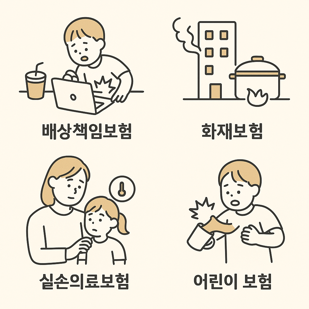 보험 종류 핵심 보장 특약 추천 세입자 전용 화재보험 실내 가전/가구 손해, 화재, 누수 피해 배상책임, 내용물손해, 도난 특약 일상생활 배상책임보험 이웃이나 타인 재산 손해 보장 어린이보험, 실손보험, 화재보험에서 선택 가능 실손의료보험 치료비 보장 없음 (개별 가입) 어린이보험 자녀 질병, 상해 보장 배상책임 특약 포함 여부 확인 반응형